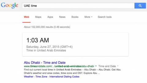 ولكن محرك بحث جوجل يُتيح مثل هذه الخدمة ببساطة وسهولة عالية، فيكفي أن يقوم المستخدم بفتح محرك بحث جوجل، ومن ثم عليه الكتابة في حقل البحث اسم المدينة باللغة الإنجليزية، يليها كلمة Time، فمثلًا لو أراد معرفة الوقت في دولة الإمارات العربية المتّحدة، يكفي كتابة UAE Time، ليظهر للمستخدم الساعة والتاريخ وفرق التوقيت عن مدينة جرينيتش.